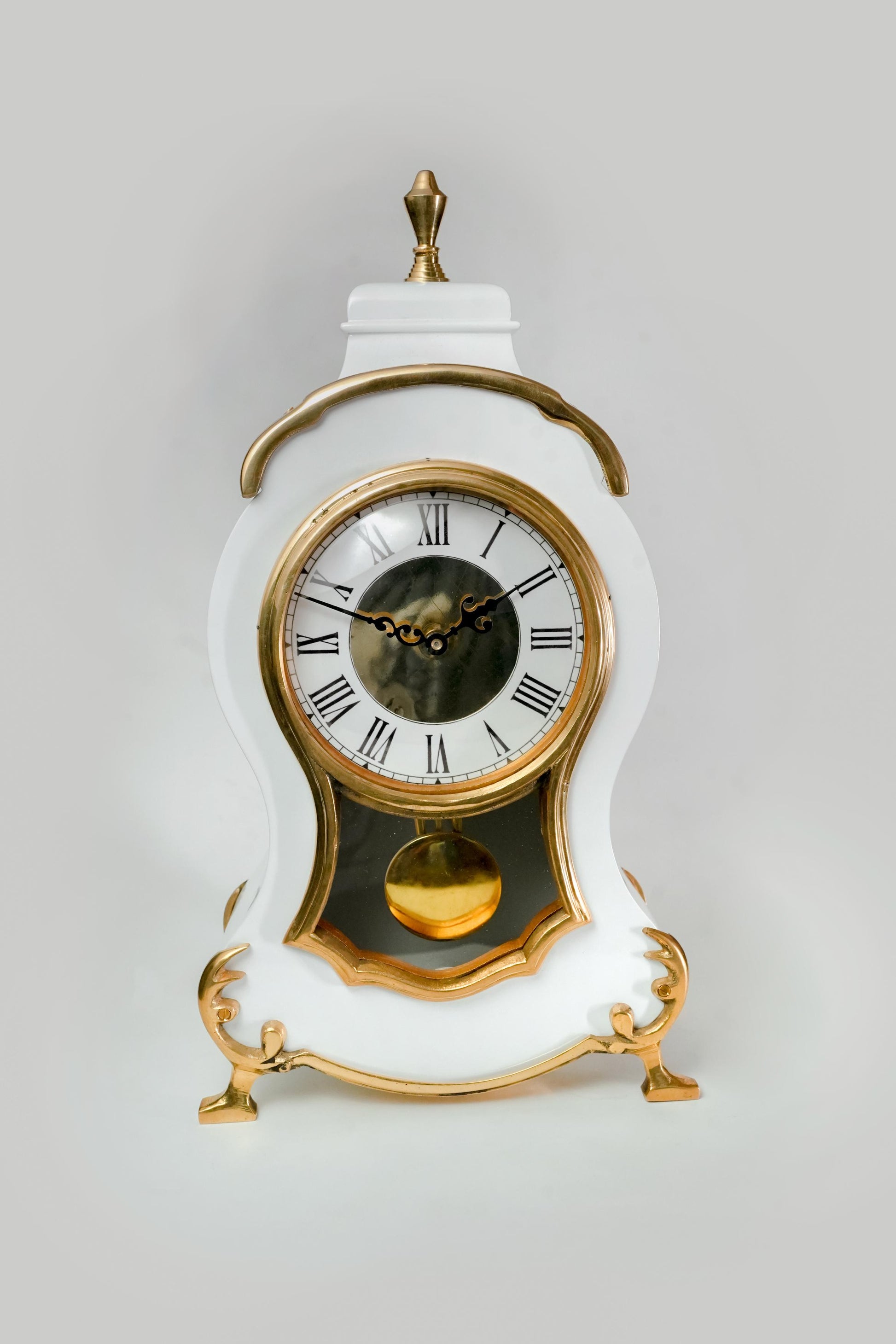 A crisp white Roman numeral dial adds to the old-world aesthetic, set behind a glass front framed in detailed brass. Every element—down to the finely sculpted handle and ornamental accents—reflects the artistry of vintage French horology.